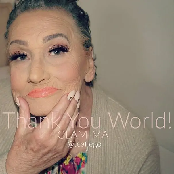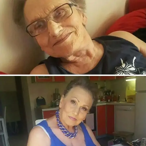 While the 80-year-old appears to be any other old woman without makeup, Tea Flego and her magic made her look completely different. Check out the photo below.