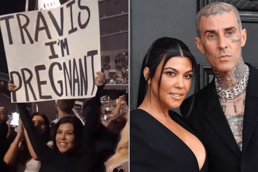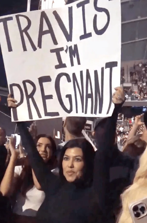 The two formally announced the news when they posted a video of the occasion on Instagram the same evening. The footage showed a Kardashian dancing and jumping around in the crowd at the event while waving a sign that read, “Travis I’m Pregnant!”