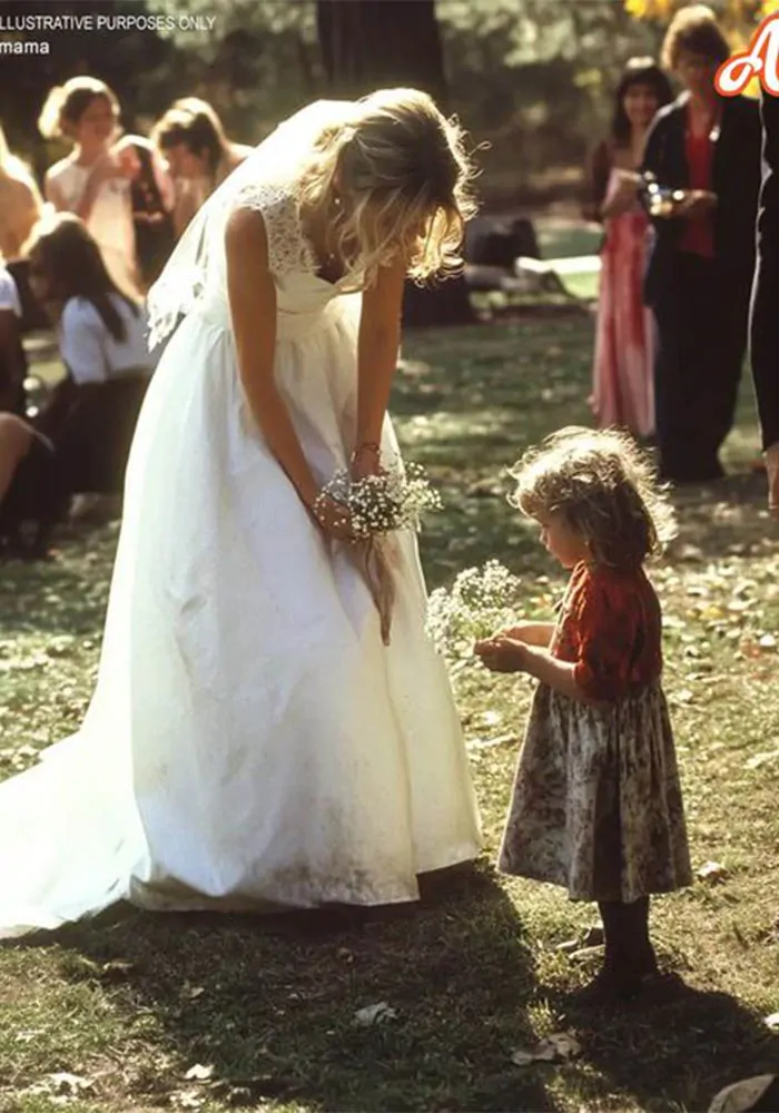 Just as the ceremony was about to begin, I saw her. A little girl, no older than five, appeared out of nowhere. She held a small bouquet of daisies, her large, curious eyes fixed on me.