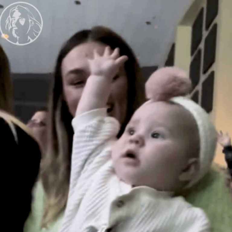Mom glows with happiness as the infant raises his hands in praise.