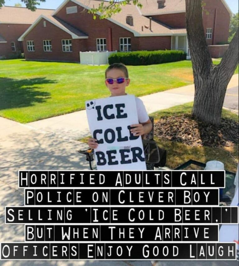 Police are called to the child selling “Ice Cold Beer,” but they are amused by his ingenious sign.